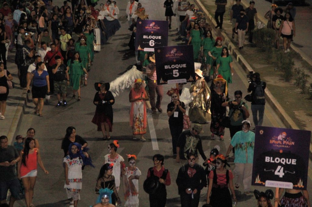 El sábado por la noche el contingente de más de 250 personas caracterizadas con pintoresca calavera de colores vivos y hermosos atuendos, partió de la avenida Chichén Itzá a un costado de la estación central de Bomberos y del Teatro 8 de Octubre, hasta la glorieta “El Ceviche” y de regreso al Palacio Municipal para entrar por el andador Tulipanes hacia el Parque de las Palapas, donde cientos de personas a lo largo de su paso, disfrutaron al máximo.
