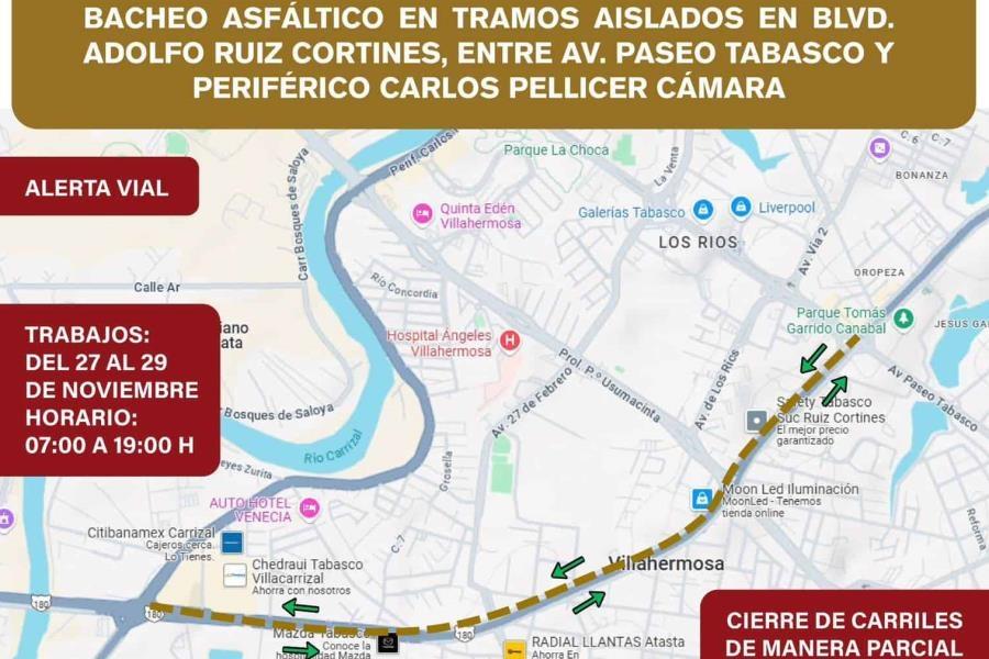 PODER Y CRÍTICA | REDACCIÓN | El Ayuntamiento de Centro informó que desde este miércoles y hasta el viernes se llevarán a cabo trabajos de bacheo asfáltico en tramos específicos del bulevar Adolfo Ruiz Cortines, entre la avenida Paseo Tabasco y el Periférico Carlos Pellicer Cámara.