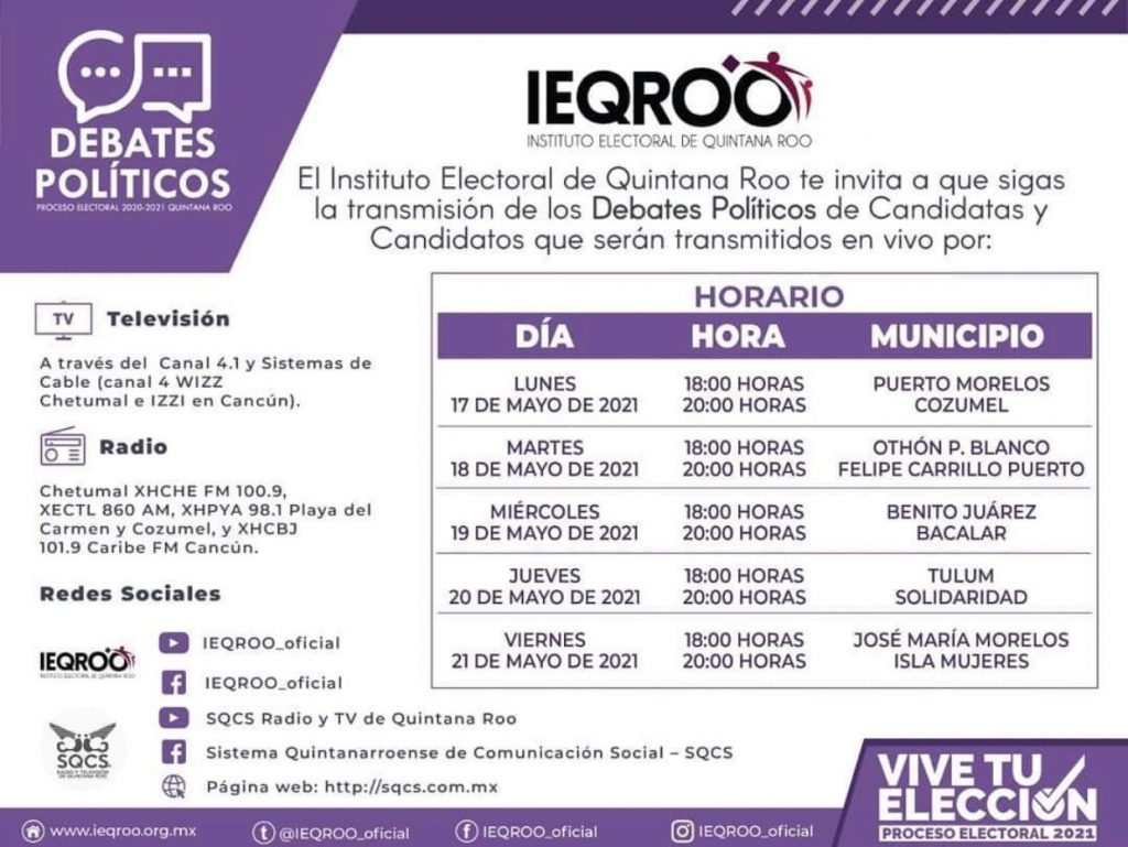 Chetumal, Q. Roo, lunes 17 de mayo de 2021, poderycrítica. – El Instituto Electoral de Quintana Roo (IEQROO), en coordinación con el Sistema Quintanarroense de Comunicación Social, organizan los debates políticos entre candidatas y candidatos a miembros de los Ayuntamientos del 17 al 21 de mayo. A partir de las 18:00 horas dan inició los debates políticos y abren la confrontación de ideas, las y los representantes del municipio de Puerto Morelos, posteriormente harán lo propio las candidatas y candidatos de Cozumel a partir de las 20:00 horas.