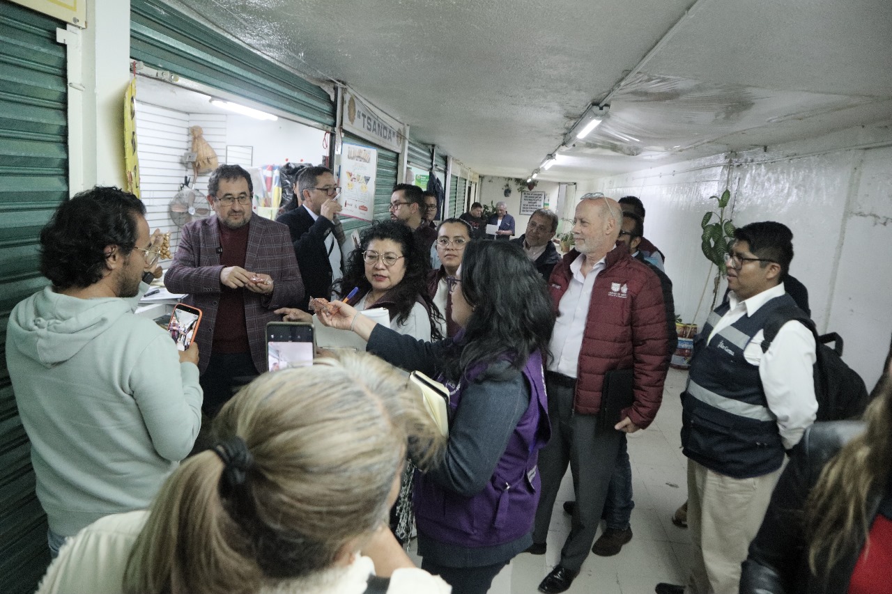 Acompañado del subsecretario de Programas de Alcaldías y Reordenamiento de la Vía Pública (SPARVP), Adolfo Llubere Sevilla, y del director General de SERVIMET, Carlos Mackinlay, el Secretario de Gobierno escuchó puntualmente los comentarios de las y los locatarios y atendió sus dudas, reiterando el compromiso del Gobierno de la Ciudad de México para garantizar que puedan regresar a sus espacios de trabajo una vez concluidas las obras de rehabilitación.