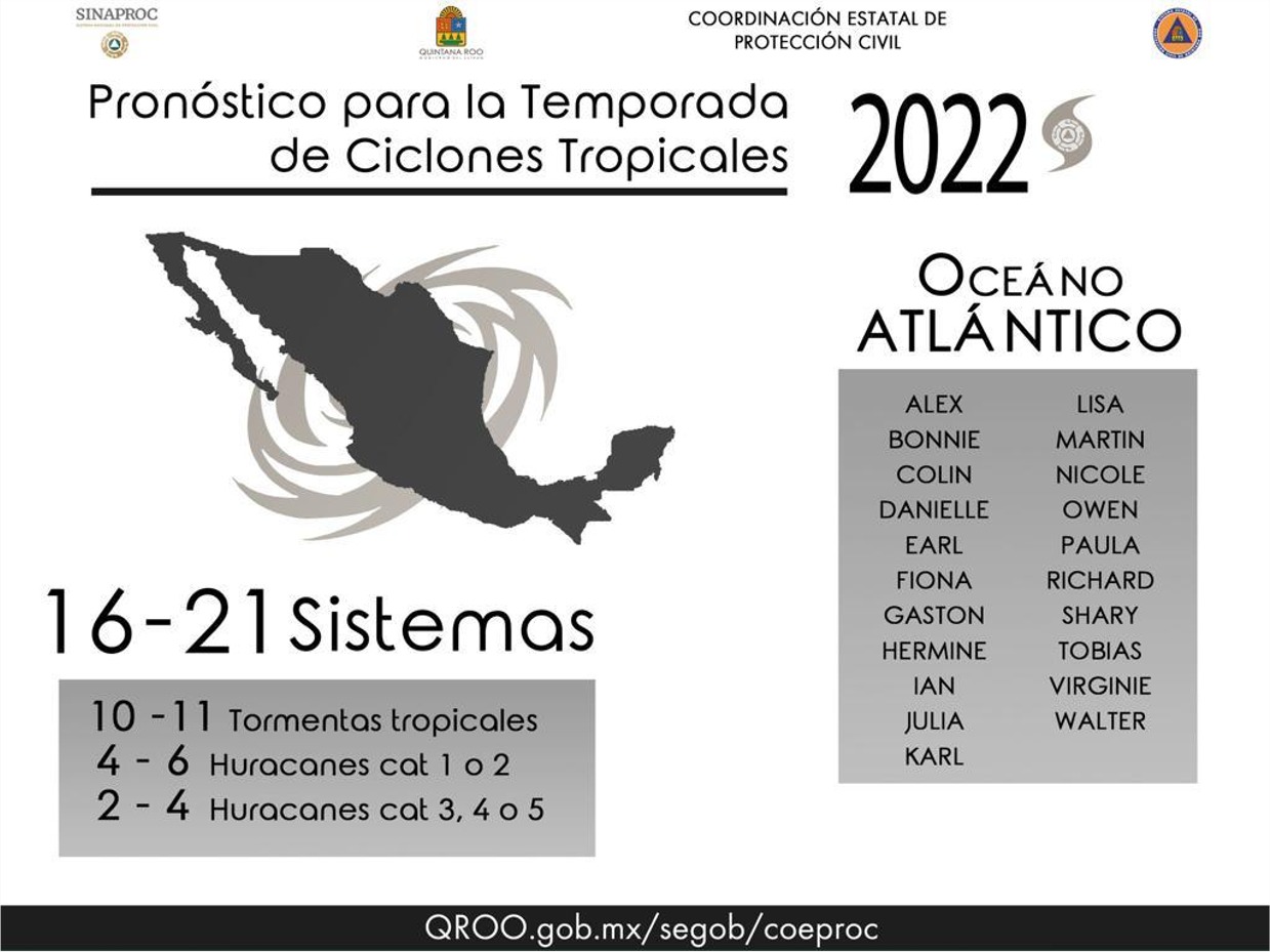 Según el Pronóstico para la Temporada de Ciclones Tropicales 2022 en el Mar Caribe y Golfo de México, se formarían de 16 a 21 ciclones tropicales, quedando más o menos de esta manera: de 10 a 11 tormentas tropicales, de cuatro a seis huracanes categoría uno y dos, así como de dos a cuatro huracanes categoría tres, manifestó.