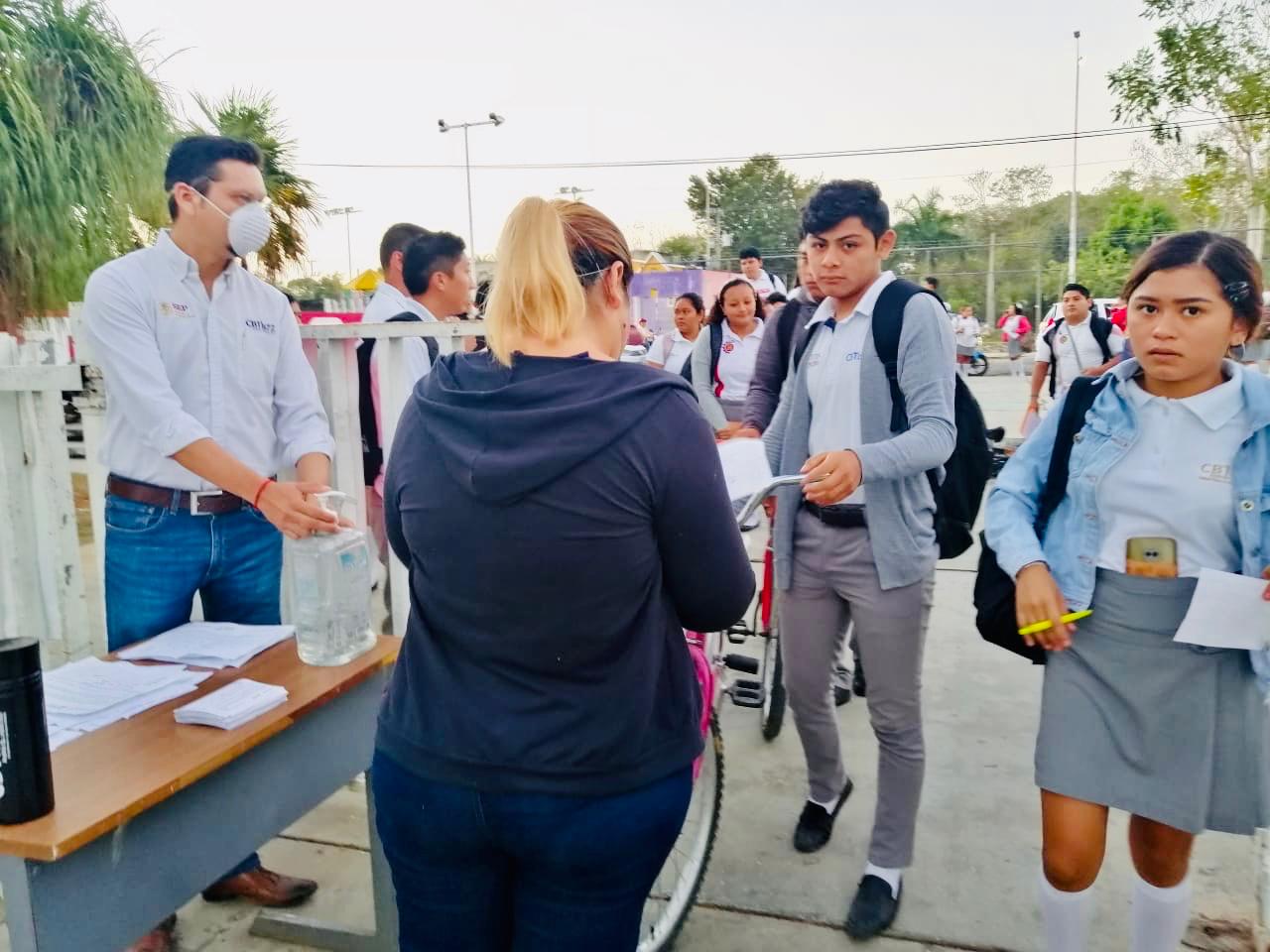 Felipe Carrillo Puerto, Q. Roo, Martes 17 de marzo de 2020, poderycrítica.- Personal del Centro de Estudios de Bachillerato Tecnológico Industrial y de Servicios, CBTIS 72, instaló un filtro sanitario a la hora de entrada a la jornada escolar de esta mañana, en la que 20 alumnos no pudieron pasar, por presentar síntomas de resfriado común.