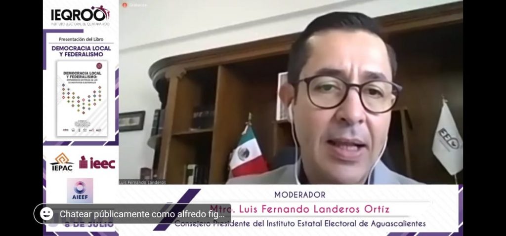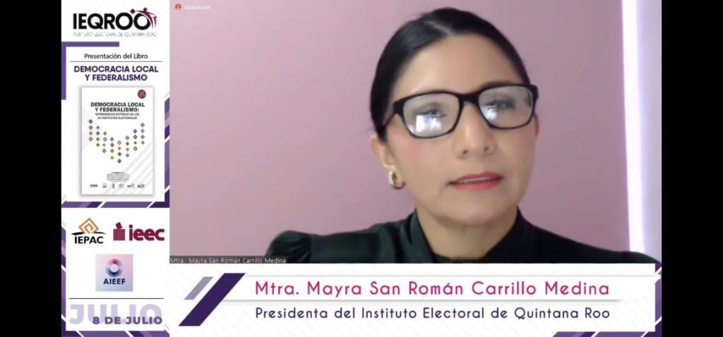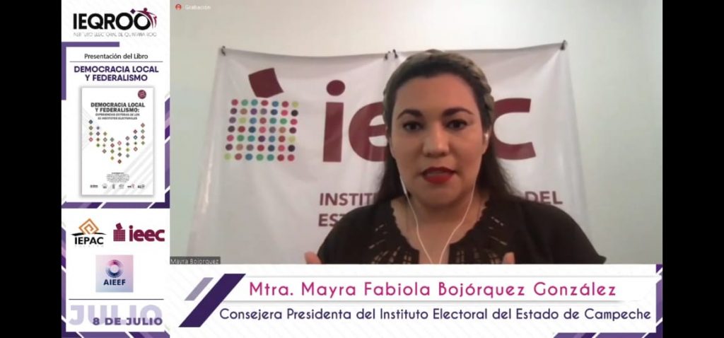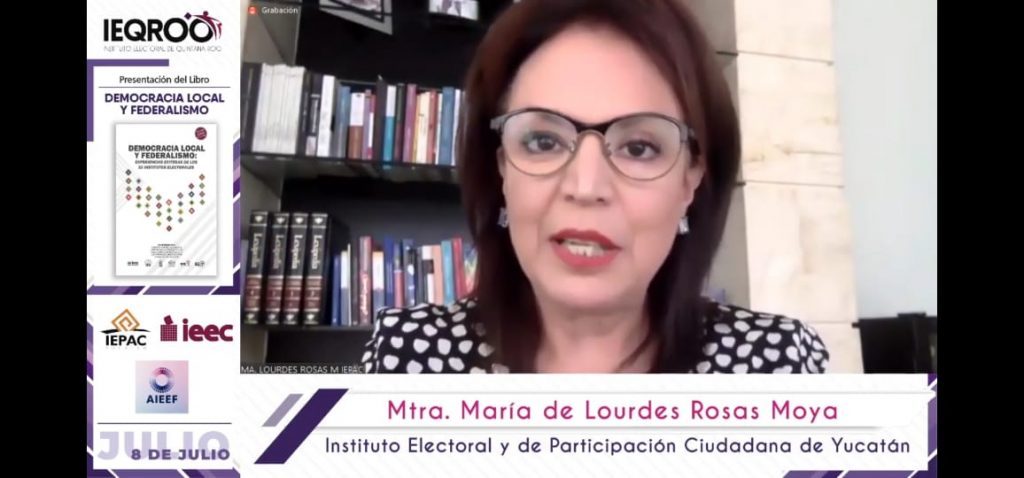 Chetumal, Q. Roo, Miércoles 08 de Julio de 2020, poderycrítica. – Con aportaciones sobre la experiencia en la organización de debates, las Juntas Municipales, urnas electrónicas y transmisiones en vivo de las Sesiones del Consejo General, fueron los temas abordados en la presentación del libro: “Democracia Local y Federalismo: Experiencias exitosas de los 32 Institutos Electorales” por las Consejeras Presidentas del Instituto Electoral de Quintana Roo (IEQROO), Mayra San Román Carrillo Medina; del Instituto Electoral y de Participación Ciudadana de Yucatán (IEPAC Yucatán), María de Lourdes Rosas Moya y del Instituto Electoral del Estado de Campeche (IEEC), Mayra Fabiola Bojórquez González. El moderador fue el Consejero Presidente del Instituto Estatal Electoral de Aguascalientes (IEEAGS), Luis Fernando Landeros Ortiz.