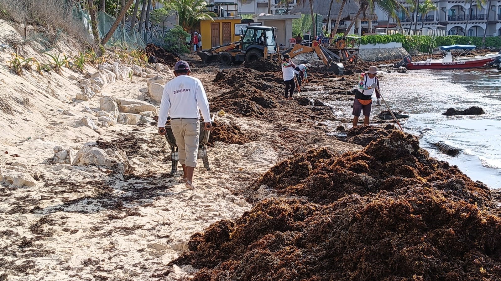 Detalló que en un esfuerzo coordinado con los tres órdenes de gobierno, en estas labores se cuenta con 7 retroexcavadoras que permiten agilizar la recolección del sargazo acumulado, especialmente por peso y el volumen considerable.