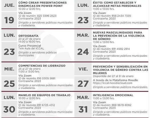 Poder y Crítica | Redacción | El Instituto de Capacitación en Calidad (ICCAL) del Ayuntamiento de Benito Juárez invita a la población en general y servidores públicos a los primeros cursos del 2023 que se ofrecen de manera gratuita de forma presencial y virtual, para mejorar su desempeño laboral o crecer personalmente.