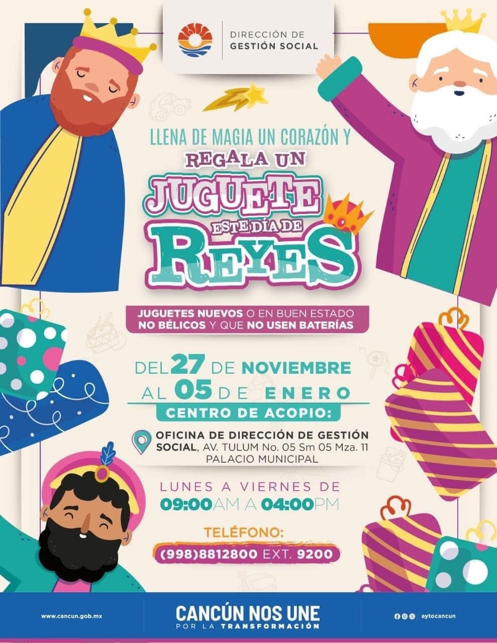 Los juguetes donados tienen que ser nuevos o usados en buen estado, que no sean bélicos y que no usen baterías. El centro de acopio estará ubicado en las oficinas de la Dirección de Gestión Social, en la Av. Tulum No. 5, Supermanzana 5, manzana 11, a un costado del Palacio Municipal.