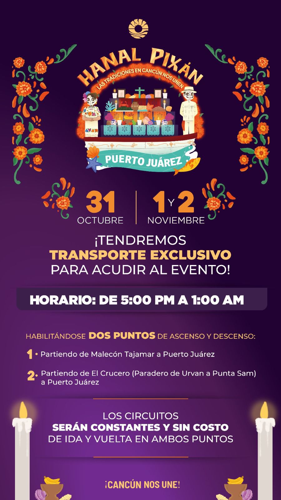Además, para que ningún ciudadano o turista se pierda de esta festividad se contará con transporte gratuito, el cual saldrá del Malecón Tajamar y del Parque del Crucero, hacia Puerto Juárez y de regreso a los mismos puntos, en horario de 17:00 a 23:00 horas.