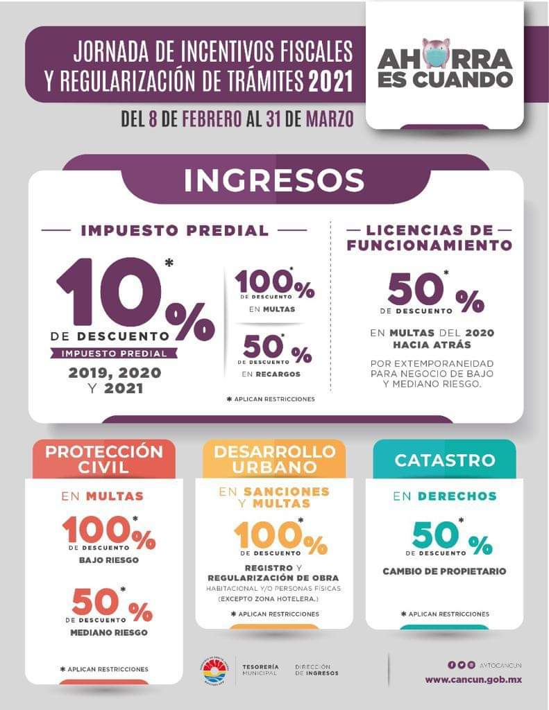 Cancún, Q. Roo, Lunes 22 de Marzo de 2021, poderycrítica.-  El gobierno municipal promueve el abatimiento de rezago y el cumplimiento de obligaciones por parte de los contribuyentes con la “Jornada de Subsidios, Estímulos Fiscales y Regularización de Trámites 2021”, que estará vigente hasta el 31 de marzo.