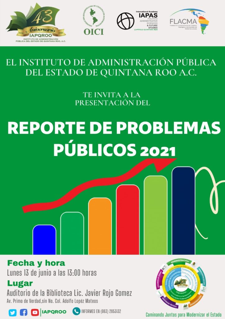 PODER Y CRÍTICA | REDACCIÓN | El Instituto de Administración Pública del Estado de Quintana Roo, A.C. (IAPQROO) hace una cordial invitación a las cámaras empresariales, asociaciones civiles, líderes sociales y de opinión, así como a las personas servidoras públicas de los tres órdenes de gobierno a la presentación del Reporte de Problemas Públicos 2021, que describe los principales programas impactados, las áreas geográficas con mayor incidencia de problemas públicos, los actores implicados, las áreas gubernamentales que más problemas públicos tienen que atender y en particular, un análisis del problema de la INSEGURIDAD.