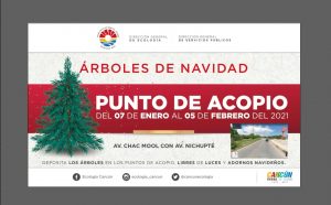La titular de la dependencia, Guadalupe Alcántara Mas, puntualizó que se instaló un centro de acopio ubicado sobre avenida Chac Mool con avenida Nichupté, el cual es exclusivo para depositar árboles de navidad libres de luces y adornos, que serán recibidos hasta el próximo 05 de febrero.