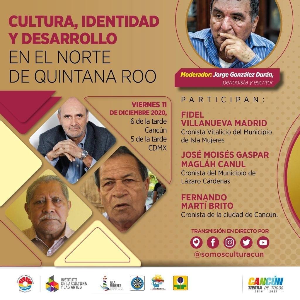 Detalló que en dicho conversatorio participarán el Cronista Vitalicio de Isla Mujeres, Fidel Villanueva Madrid; el Cronista del municipio de Lázaro Cárdenas, José Moisés Gaspar Maglán Canul y el Cronista de Cancún, Fernando Martí Brito, siendo moderador el periodista y escritor, Jorge González Durán.