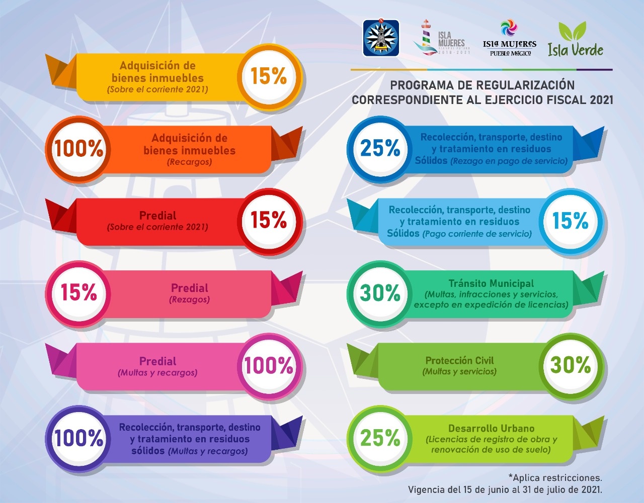 Isla Mujeres, Q. Roo, Jueves 24 de Junio de 2021, poderycrítica.- Con descuentos que van desde el 15 hasta el 100 por ciento, el gobierno de Isla Mujeres que encabeza Juan Carrillo Soberanis, ha puesto en marcha hasta el próximo 31 de julio, el «Programa de Regularización Correspondiente al Ejercicio Fiscal 2021».