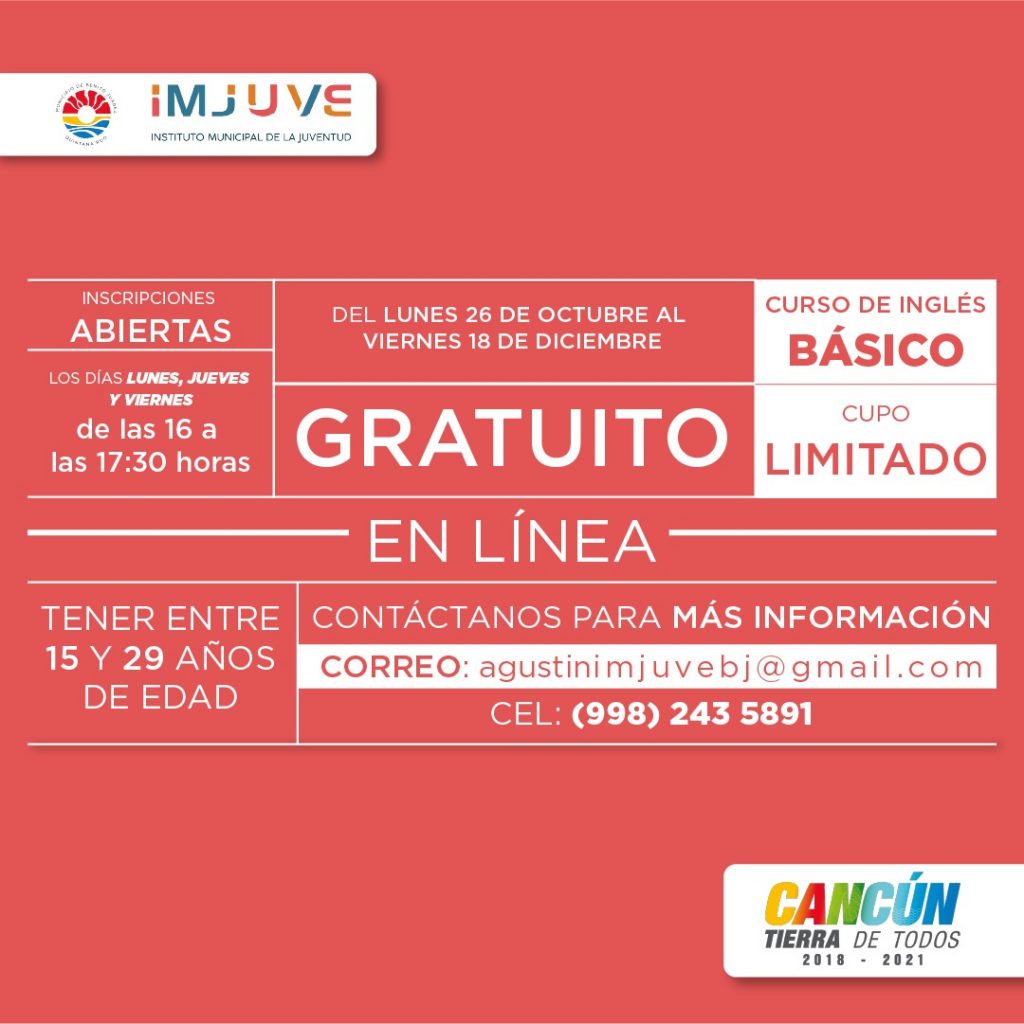 Cancún, Q. Roo, Sábado 24 de Octubre de 2020, poderycrítica.- El Instituto Municipal de la Juventud (IMJUVE) del Ayuntamiento de Benito Juárez presenta la quinta edición del programa “Inglés para todos”, el cual se impartirá de manera gratuita a partir del próximo 26 de octubre y cuya convocatoria continúa abierta.