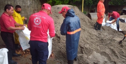 Añadió que el Ayuntamiento de Centro apoyó con arena y personal del Heróico Cuerpo de Bomberos realiza en estos momentos la colocación de los costales, con apoyo de los habitantes de la zona.