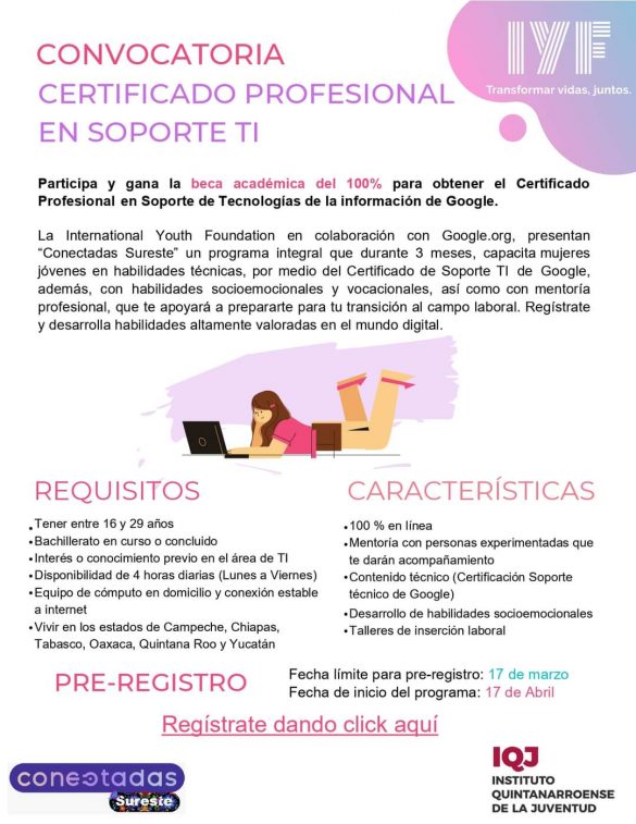 PODER Y CRÍTICA | REDACCIÓN | El Instituto Quintanarroense de la Juventud invita a mujeres jóvenes de 16 a 29 años de edad a participar en la convocatoria denominada “Conectadas Sureste”, un programa integral que durante tres meses capacita a mujeres sobre habilidades técnicas por medio del Certificado de Soporte TI de Google, además con habilidades socioemocionales y vocacionales, así como con mentoría profesional que ofrece la posibilidad de prepararse para su transición al mundo laboral.