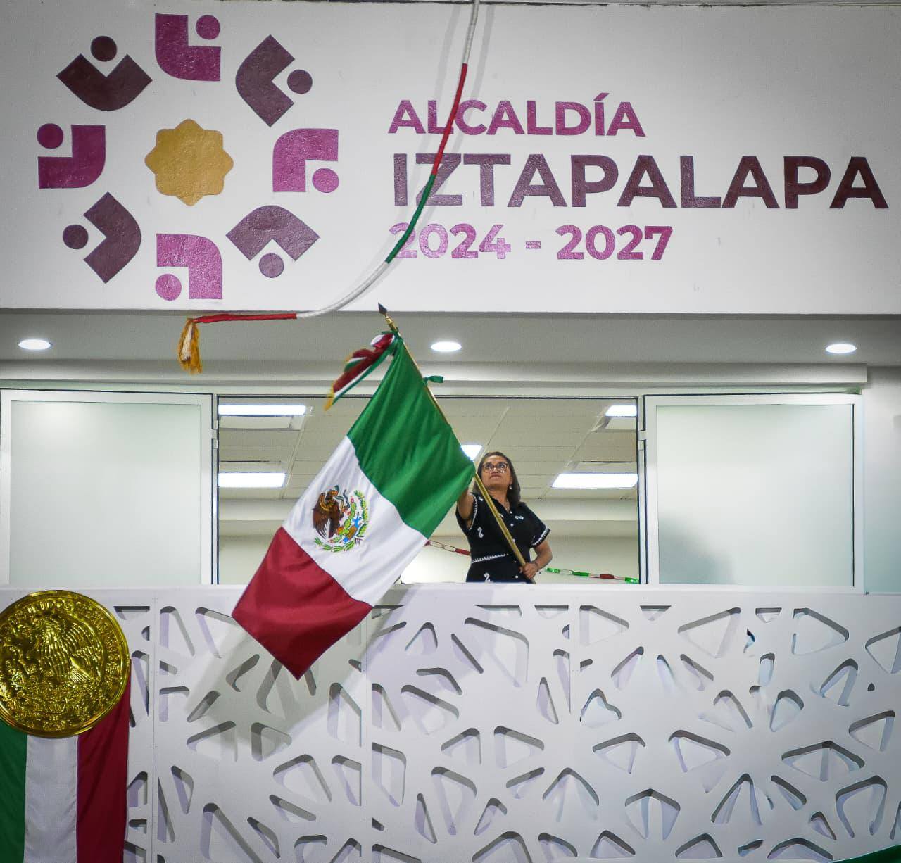 “¡Viva Iztapalapa solidaria y cuidadora!”, exclamó la edil, vestida de negro como señal de luto, mientras ondeaba la Bandera Nacional.