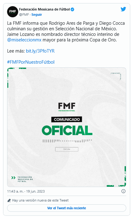 «A 35 meses y medio del arranque de la Copa del Mundo en nuestra casa, tomé la decisión de nombrar a Jaime Lozano como director técnico interino para que haga frente a la Copa Oro. Le agradezco por aceptar dirigir al equipo de aquí al final de este torneo, los jugadores te conocen y te quieren bien, Jaime”, informó el comisionado presidente de la Femexfut, Juan Carlos Rodríguez.