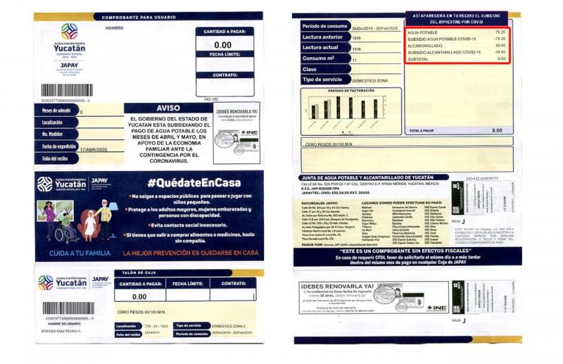 Además, debajo del documento aparece el siguiente aviso: «El Gobierno del Estado de Yucatán está subsidiando el pago de agua potable los meses de abril y mayo, en apoyo de la economía familiar ante la contingencia por el coronavirus».