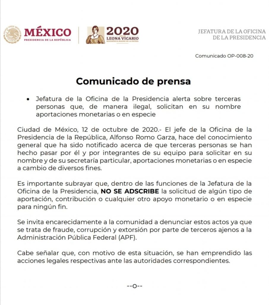 Ciudad de México, Lunes 12 de Octubre de 2020, poderycrítica.- El jefe de la Oficina de la Presidencia de la República, Alfonso Romo Garza, hace del conocimiento general que ha sido notificado acerca de que terceras personas se han hecho pasar por él y por integrantes de su equipo para solicitar en su nombre y de su secretaría particular, aportaciones monetarias o en especie a cambio de diversos fines.
