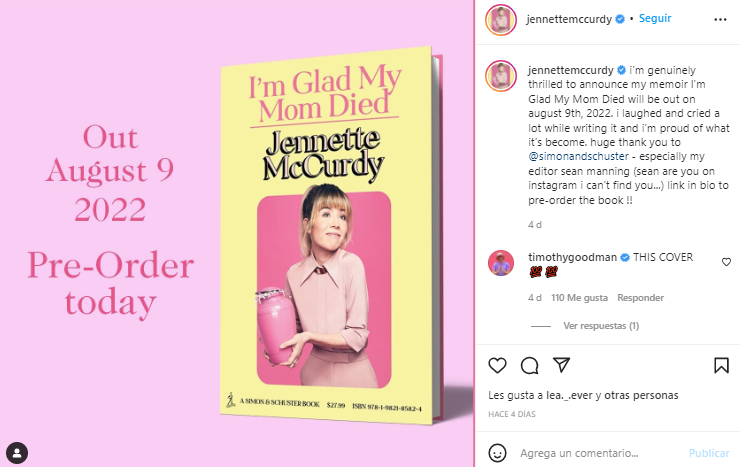 «Estoy realmente emocionada de anunciar que mis memorias ‘I’m Glad My Mom Died’ estarán disponibles el 9 de agosto de 2022. Me reí y lloré mucho mientras las escribía y estoy orgullosa de lo que se ha convertido. Mucas gracias a @simonandschuster, especialmente a mi editor Sean Manning», mencionó.