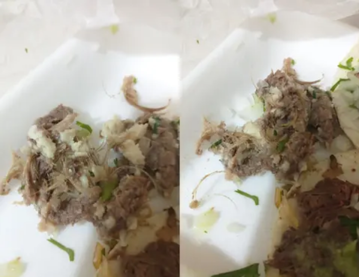 Cuando el joven llegó a su domicilio para disfrutar de su comida, mencionó que todo marchaba bien hasta que le dio una mordida a su taco de carne de cabeza de res y sintió una gran cantidad de cabello en su boca; en ese momento, escupió la comida y se llevó la desagradable sorpresa.