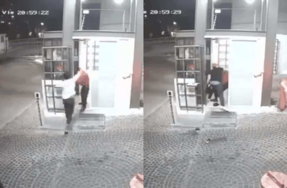 La agresión quedó grabada por varias cámaras de seguridad. Se observa cómo dos hombres bajan de su auto y sin motivo aparente, se acercan a la cabina de vigilancia para lanzarle una bebida al trabajador y golpearlo.