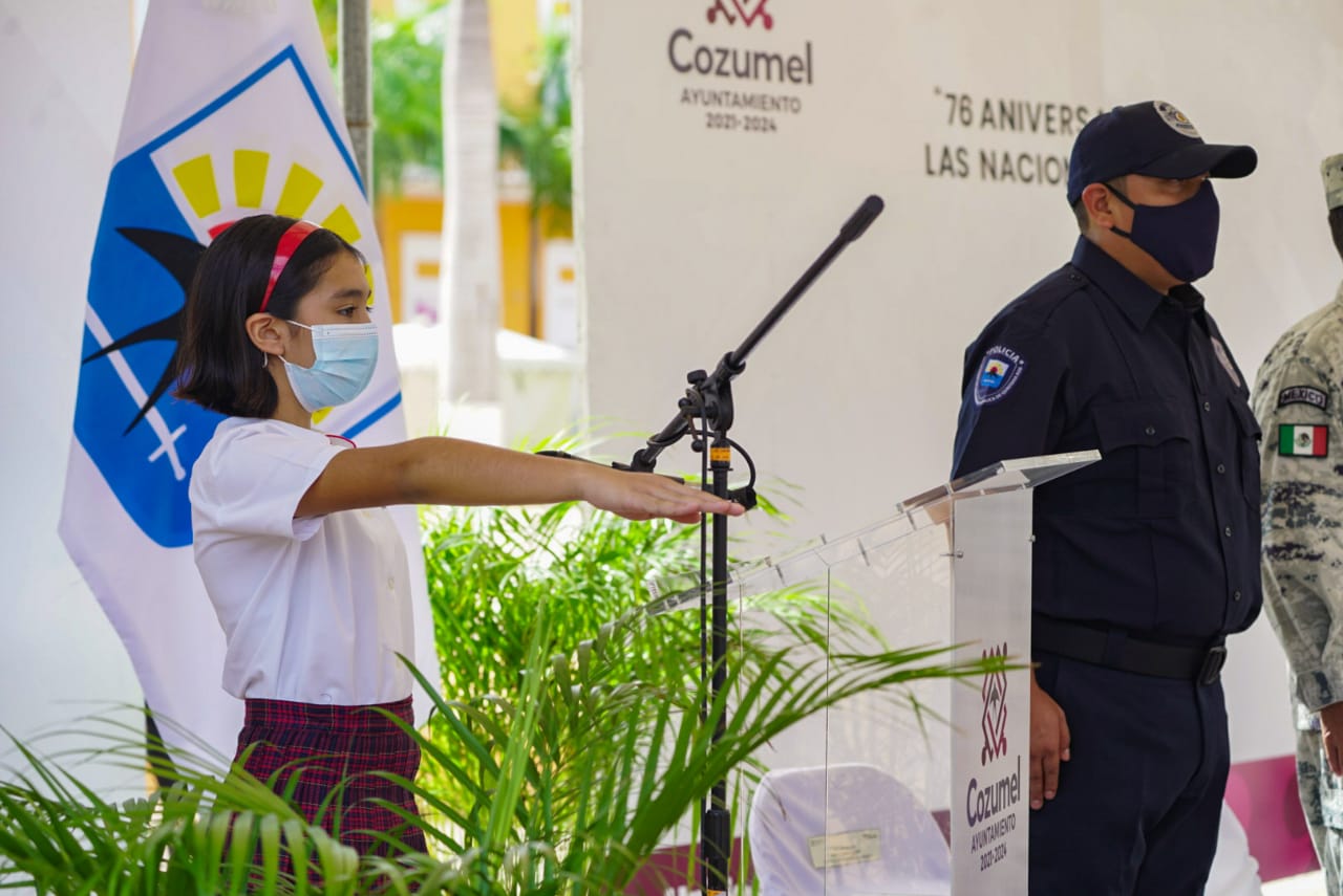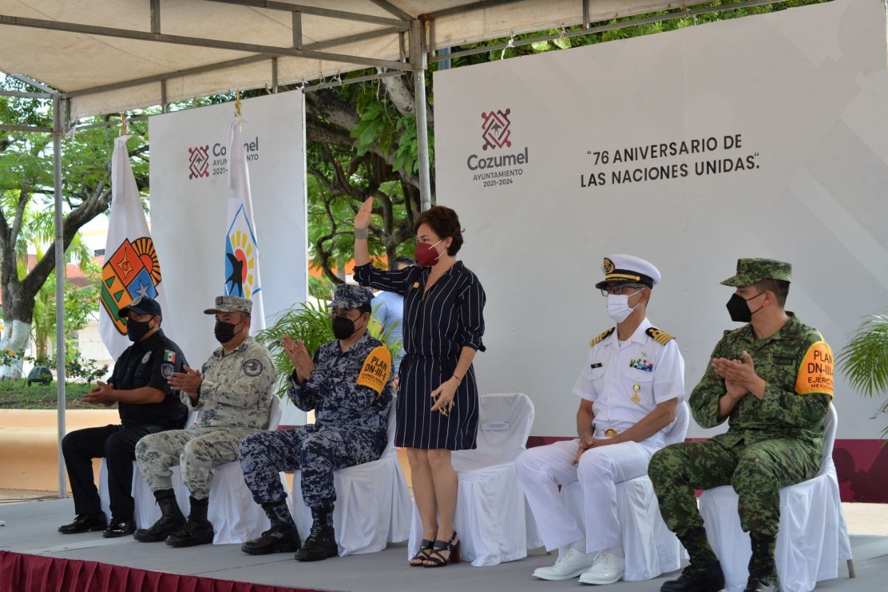 Cozumel, Quintana Roo, lunes 25 octubre de 2021, poderycritica. – “En la actualidad la Organización de las Naciones Unidas (ONU) se mantienen firmes para hacerle frente a la pobreza, proteger al planeta y alcanzar una mejor calidad de vida para la humanidad, a pesar de las adversidades que se presenten como fue la pandemia”, expresó la presidente municipal Juanita Alonso Marrufo al encabezar el evento cívico para conmemorar el LXXVI Aniversario de la ONU.