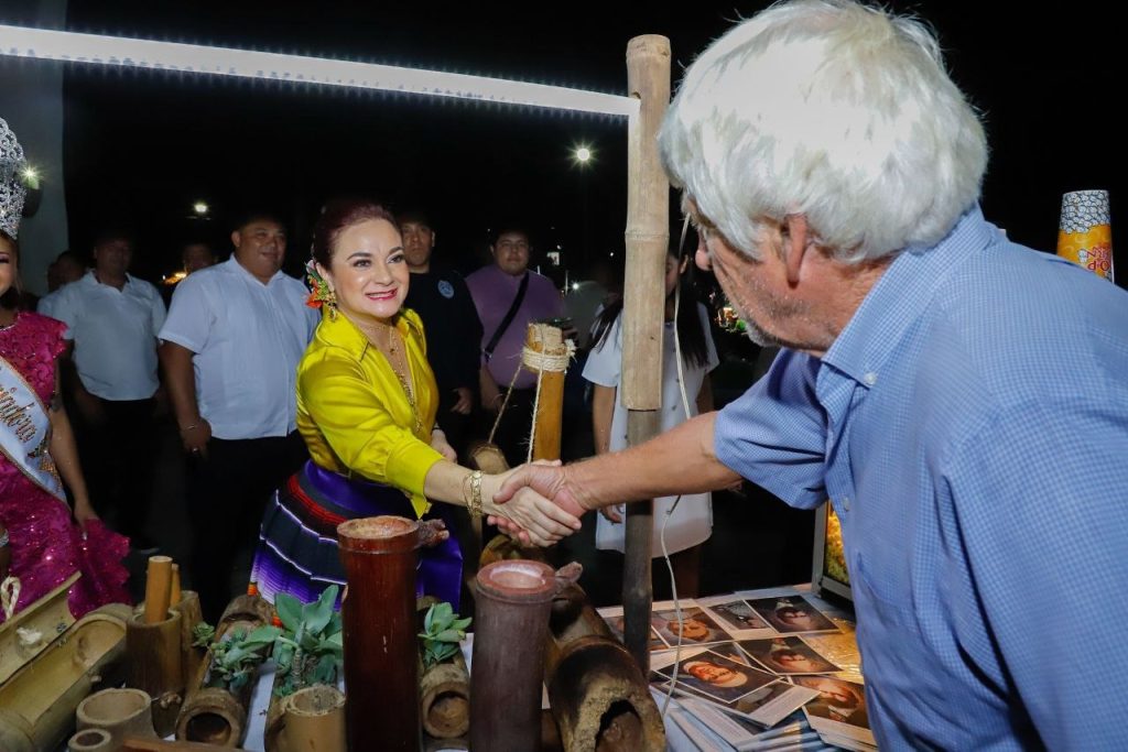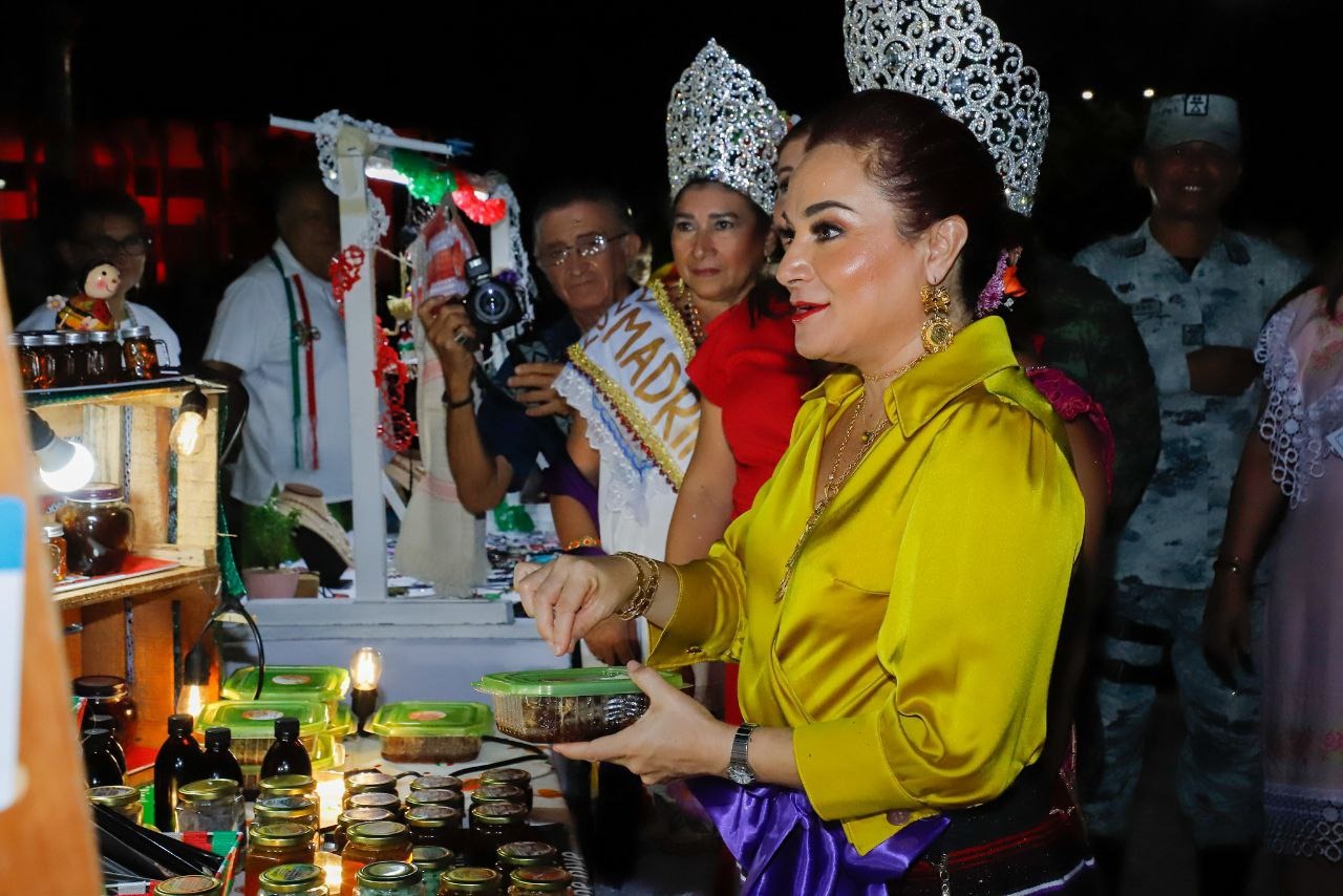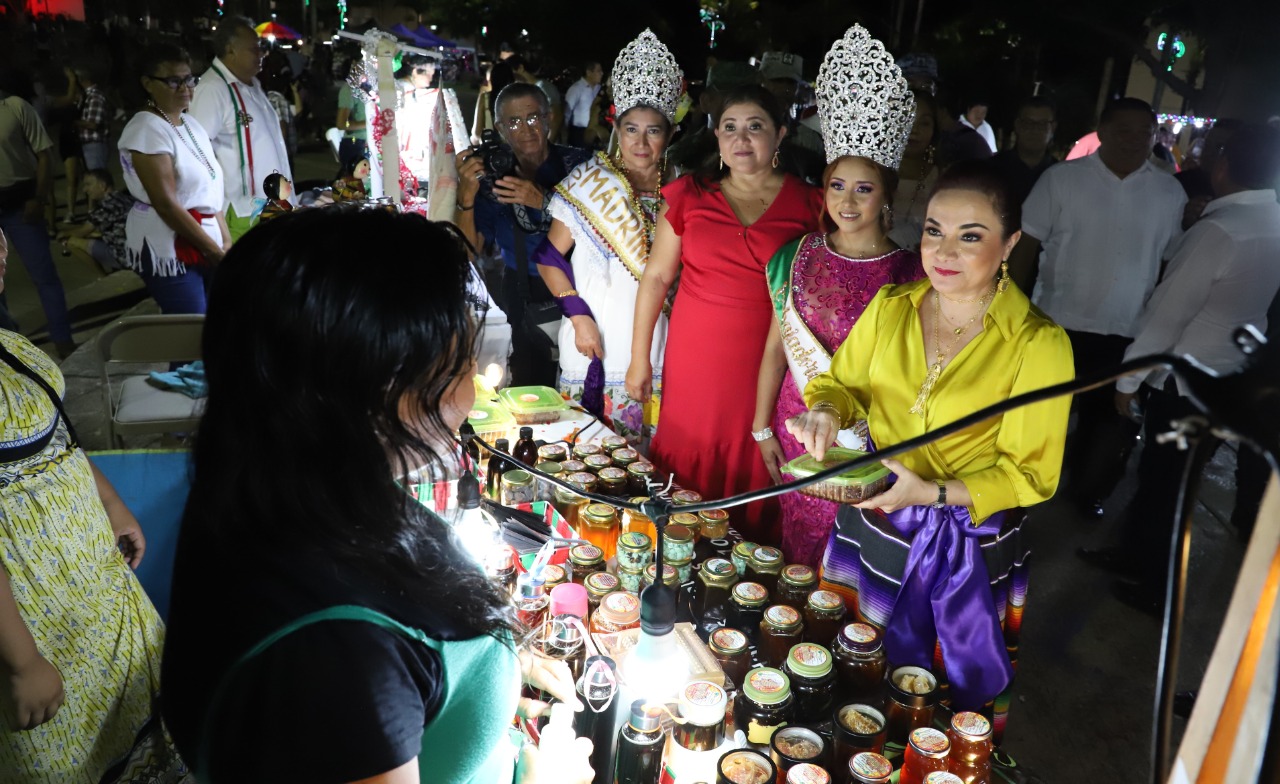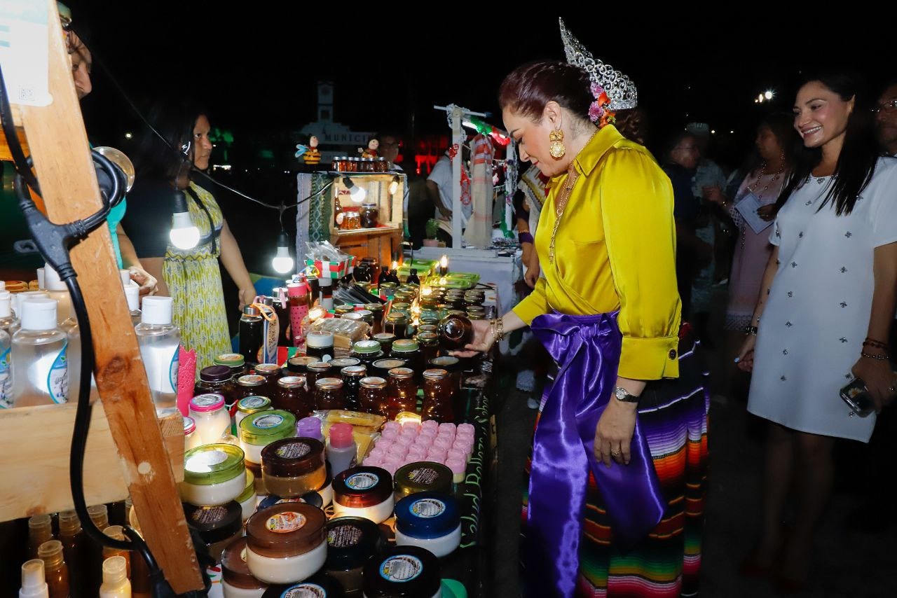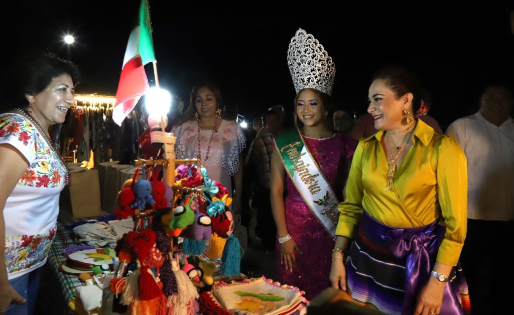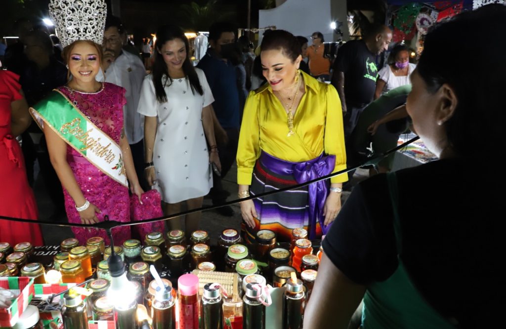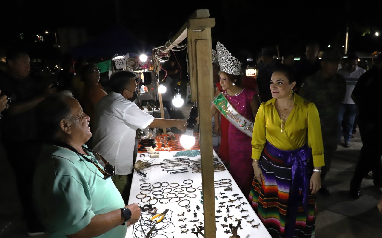 En su recorrido la munícipe, quien estuvo acompañada de la presidenta del sistema DIF Cozumel, Susana del Mar Coral Villanueva, visitó cada uno de los puestos para saludar y dar la bienvenida a los comerciantes que se animaron a participar con sus ventas en este espacio público que luce las decoraciones patrias.