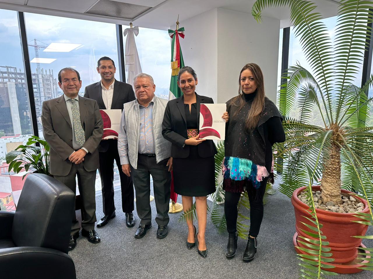 Karla Almanza y el titular de la Consejería Jurídica, Carlos Fuentes del Río, se reunieron con el director general del IMPI, José Sánchez Pérez, para concretar la firma de un convenio de coordinación, para junio de este año, a fin de trabajar en la emisión de estas declaratorias de protección de origen e indicación geográfica de los productos artesanales.