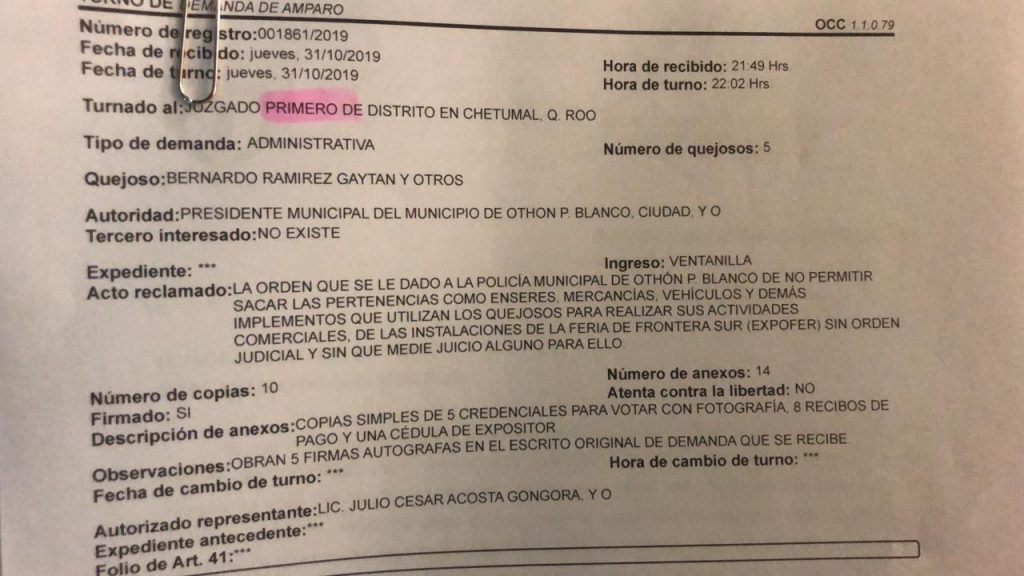 Chetumal, Q. Roo, viernes 01 de noviembre.- Un juez Primero de Distrito, con sede en Chetumal, otorgó un amparo a comerciantes de la Expoferia que eran acosados por el presidente municipal de Othón P. Blanco, Othoniel Segovia, para que les pagara un derecho por el derecho a participar en la exposición cuando ya habían cubierto su pago.