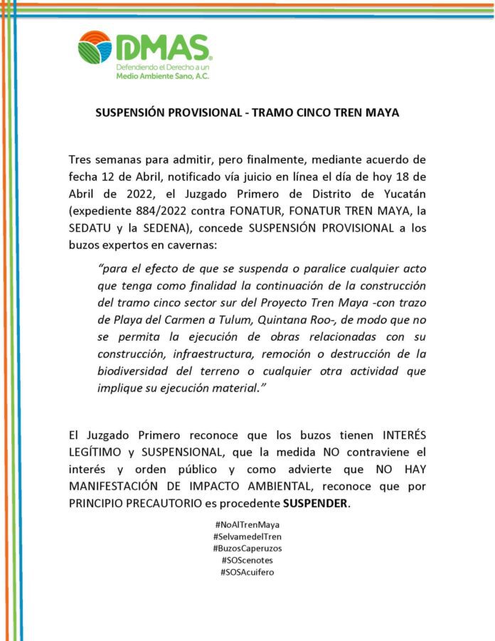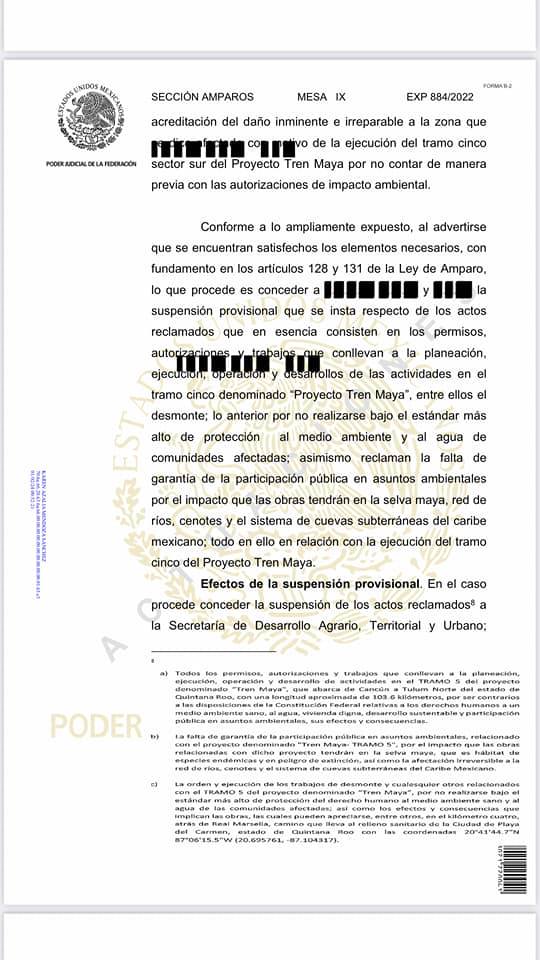 En el expediente 884/2022 contra FONATUR, la SEDATU y la SEDENA se dió la suspensión para paralizar cualquier acto que tenga como finalidad la continuación de la construcción del tramo cinco sur de este proyecto, con trazo de Playa del Carmen a Tulum.