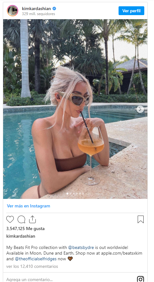 La imagen elegida se encuentra en su Instagram y corresponde a una pauta publicitaria con la marca de audífonos ‘Beat’. Kim se encuentra en la alberca mientras disfruta de una bebida y utiliza el producto.