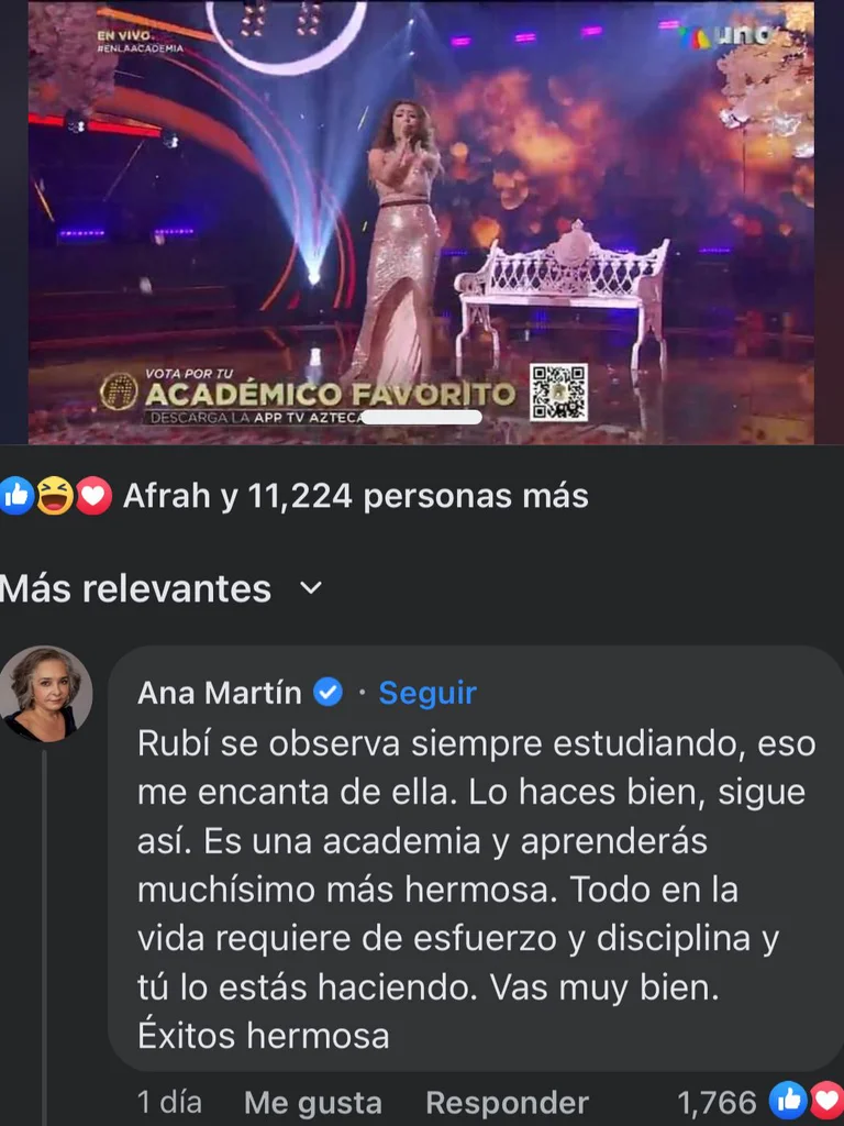“Rubí se observa siempre estudiando, eso me encanta de ella. Lo haces bien, sigue así. Es una academia y aprenderás muchísimo más hermosa. Todo en la vida requiere de esfuerzo y disciplina y tú lo estás haciendo. Vas muy bien. Éxitos hermosa”, comentó desde su perfil verificado en la red social.
