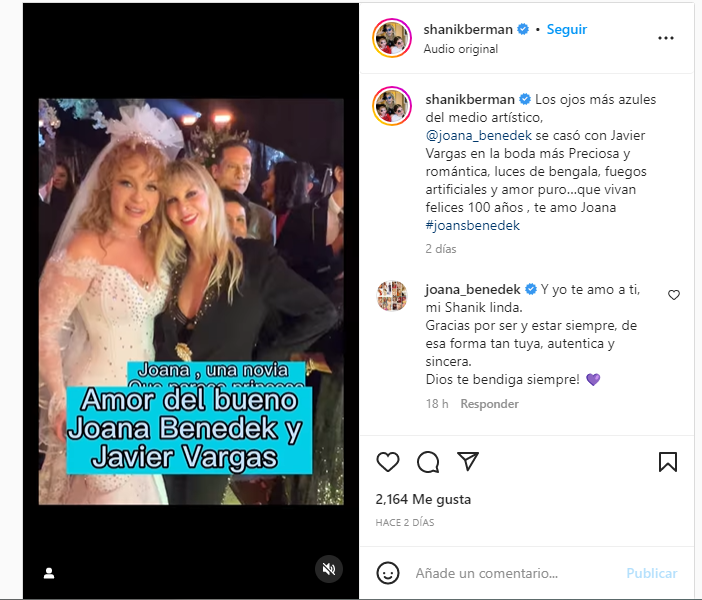 «Los ojos más azules del medio artístico. Joana Benedek se casó con Javier Vargas en la boda más preciosas y romántica. Luces de bengala, fuegos artificiales y amor puro. Que vivan felices 100 años», escribió Berman en Instagram.