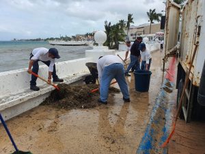 Cozumel, Q. Roo, Miércoles 04 de Noviembre del 2020, poderycrítica.- La Administración Portuaria Integral de Quintana Roo (APIQROO), encabezada por la directora general Alicia Ricalde Magaña, trabaja en la limpieza del sargazo que recaló en las inmediaciones del muelle fiscal “San Miguel”, debido al fuerte oleaje que prevalece en la rada de Cozumel.