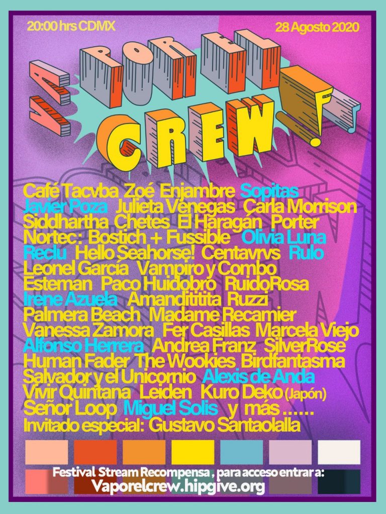 La campaña de recaudación de fondos ¡Va por el crew! para apoyar a personas que trabajan en la producción de eventos musicales en vivo anunció hace unos días los detalles del concierto en línea que se realizará este viernes 28 de agosto a las 20:00 hrs. (CDT), cuyo acceso será la recompensa por realizar un donativo en la plataforma https://vaporelcrew.hipgive.org.