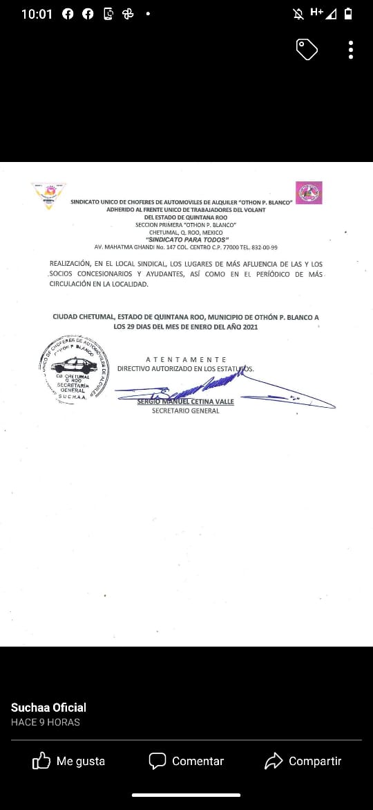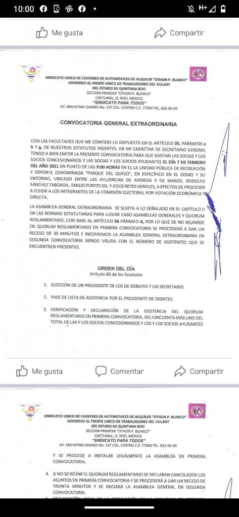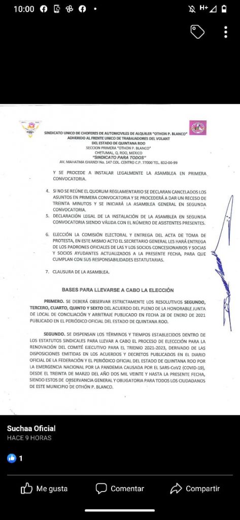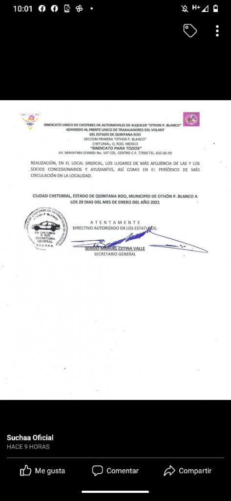 Chetumal, Q. Roo, Sábado 30 de enero de 2021, poderycrítica.- Sergio Zetina Valle, ex secretario general del Sindicato Único de Choferes de Automóviles de Alquiler (Suchaa) convocó a una asamblea extraordinaria para la designación de la Comisión Electoral, con la intención de poner a modo a los integrantes e imponer a su sucesor, Julio César Castilla Zapata.
