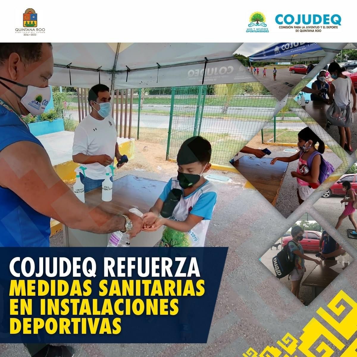 Chetumal, Q. Roo, Jueves 15 de Octubre del 2020, poderycrítica.- La Comisión para la Juventud y el Deporte de Quintana Roo (COJUDEQ), no baja la guardia en el combate a la pandemia de Covid-19 y por instrucciones de su titular, Antonio López Pinzón, refuerza las medidas sanitarias en todas las instalaciones deportivas del estado.