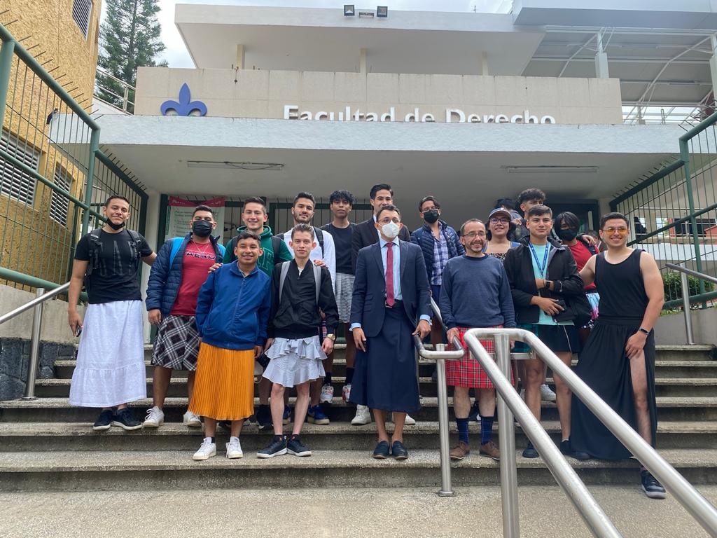 Poder y Crítica | Redacción | Con el objetivo de realizar un experimento social para reflexionar sobre la inclusión, estudiantes y profesores de la Facultad de Derecho de la Universidad Veracruzana acudieron a clases este martes vestidos con falda.