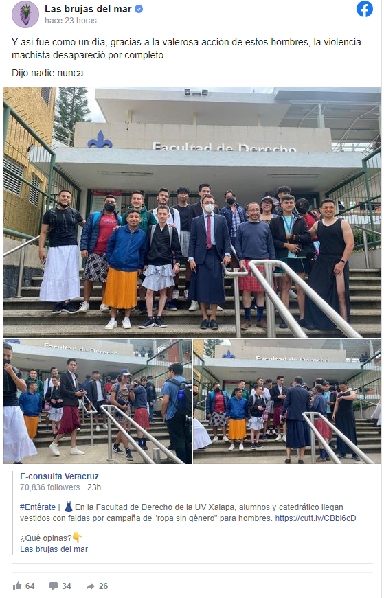 Asimismo, el colectivo feminista “Las Brujas Del Mar” criticó la propuesta para visibilizar tanto las identidades de género así como el acoso que sufren las mujeres por utilizar falda.