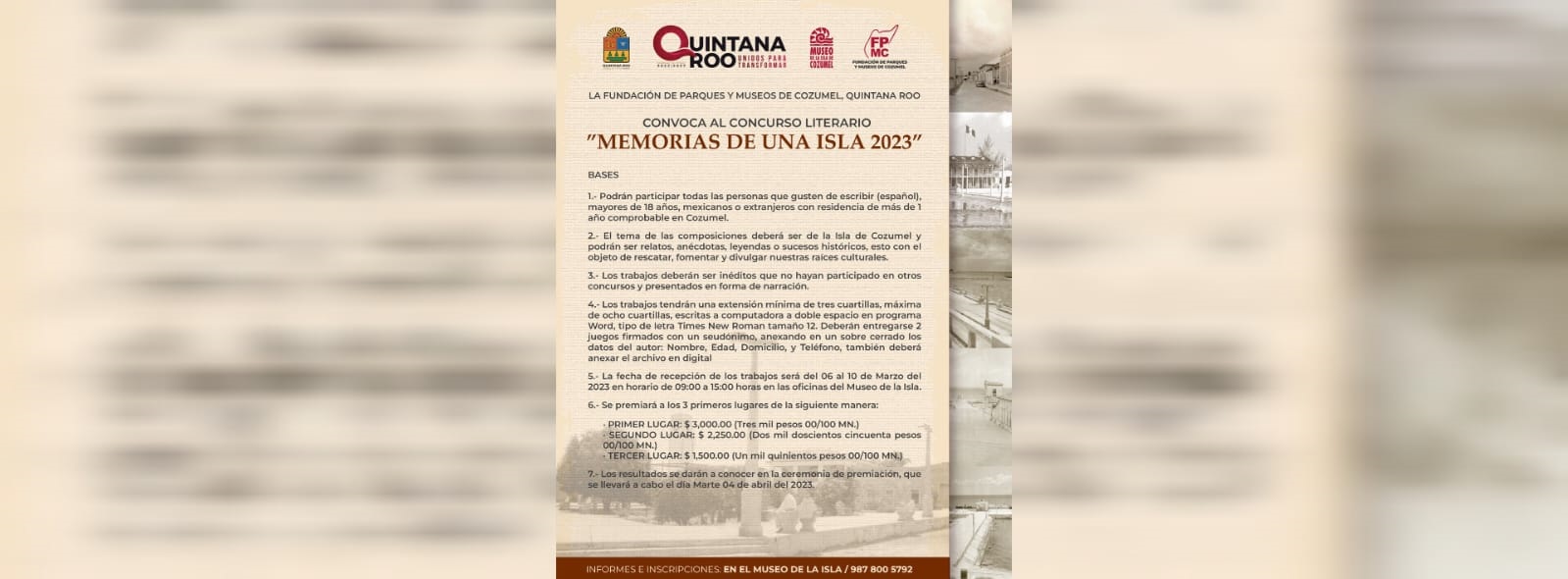 PODER Y CRÍTICA | REDACCIÓN | Con el objetivo de rescatar, fomentar y divulgar las raíces culturales de Cozumel, enmarcadas en el 36 aniversario del Museo de la Isla, la Fundación de Parques y Museos de la Isla (FPMC) convoca a escritores y escritoras mayores de 18 años de edad que vivan en la ínsula a participar en el Concurso Literario “Memorias de una Isla”.