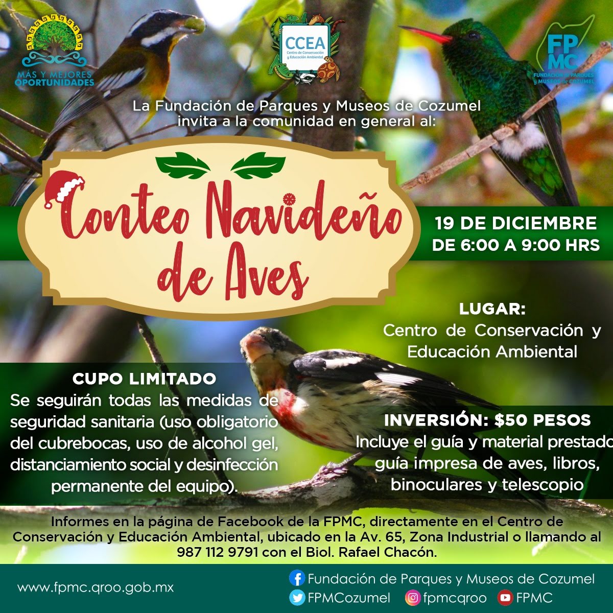 Cozumel, Q. Roo, Martes 08 de Diciembre del 2020, poderycrítica.- La Fundación de Parques y Museos de Cozumel (FPMC) convoca a niños, niñas, jóvenes y adultos a participar en el evento de observación de avifauna “Conteo Navideño de Aves”, que se llevará a cabo el sábado 19 de diciembre, a las 06:00 horas, en el Centro de Conservación y Educación Ambiental (CCEA).