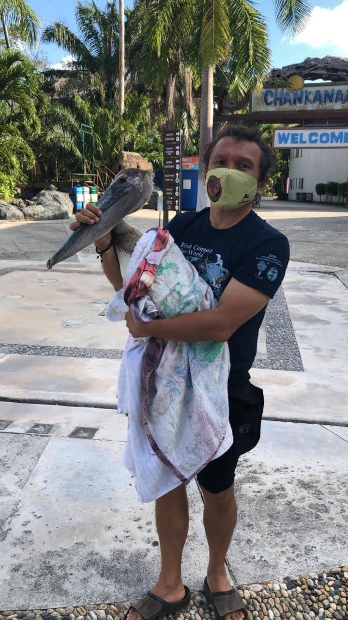 Cozumel, Q. Roo, Jueves 01 de Abril de 2021, poderycrítica.- Como resultado de la oportuna intervención del personal de la Fundación de Parques y Museos de Cozumel (FPMC) y el apoyo del Centro Médico Veterinario, se logró salvar a un ejemplar de pelicano pardo, que sufrió una fractura expuesta en un ala, al impactarse en las inmediaciones del Parque Natural Chankanaab.