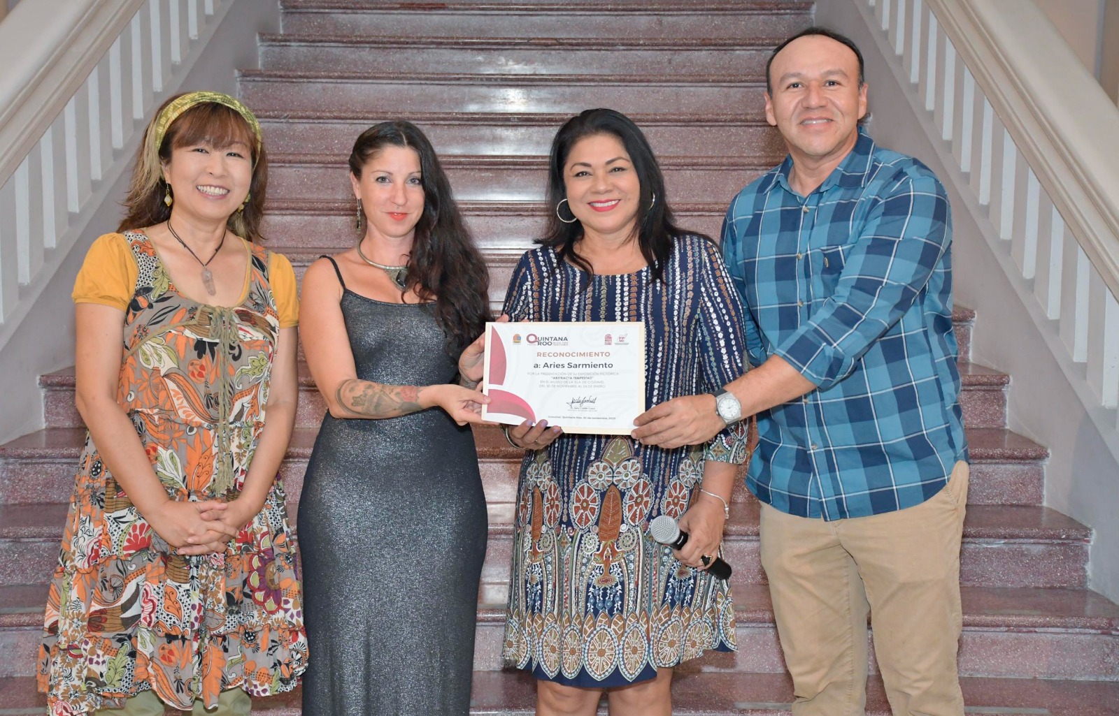 Isela Carrillo Cupul, directora del Museo de la Isla; Alejandro Queb Franco, consejero de la FPMC y Satoko Kitamura, museógrafa de la institución, encabezaron la ceremonia inaugural e hicieron entrega de un reconocimiento a la pintora Aries Sarmiento, por presentar por primera ocasión su trabajo en el centro museográfico de la isla.