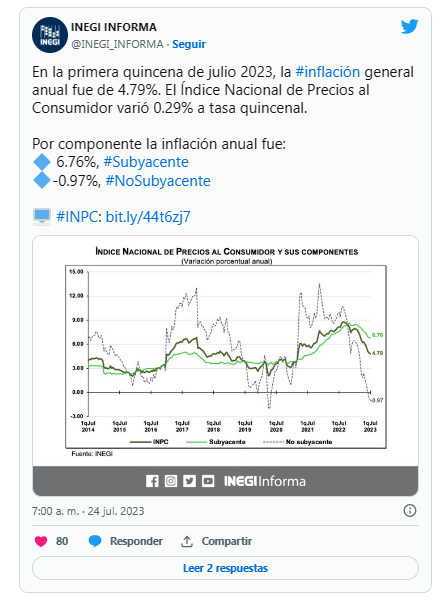 En el informe dado a conocer hoy 24 de julio de 2023, el Inegi reportó que el índice de precios subyacente aumentó 6.76% a tasa anual, mientras que el de precios no subyacente presentó una caída del 0.97% a tasa anual.