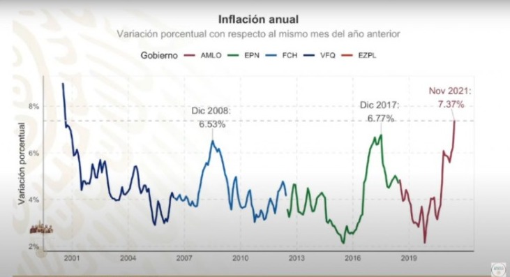 El mandatario federal aseguró que el alza en la inflación es un fenómeno externo y leyó una tabla con diversos porcentajes de inflación en la que México se encontraba en tercer lugar, sólo abajo de Brasil y Rusia.