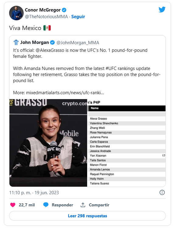 Ante una publicación que se dio para conocer el ranking de la UFC, el irlandés Conor McGregor lanzó un “¡Viva México!” para celebrar la distinción para Alexa Grasso.