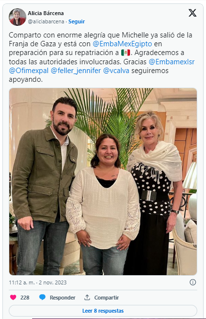 Poder y Crítica | Redacción | Este jueves, la titular de la Secretaría de Relaciones Exteriores (SRE), Alicia Bárcena, informó que Michelle Rabel ya había salido de la Franja de Gaza y se encontraba en la embajada de México en Egipto en espera de su repatriación.