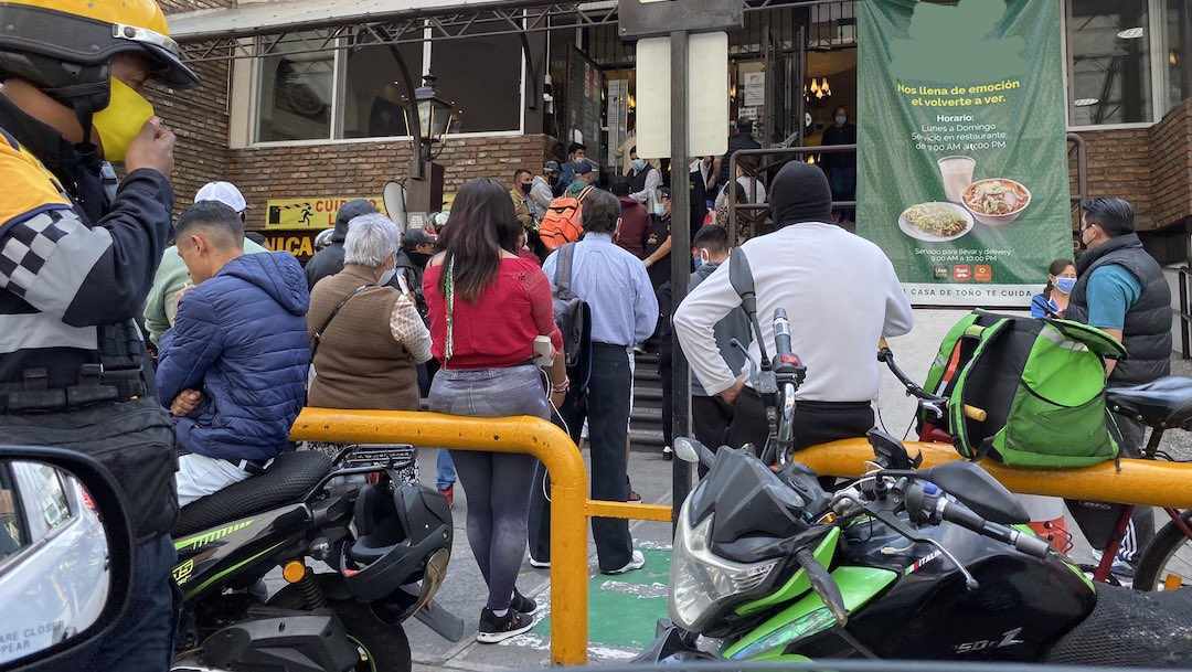 Tanto particulares como repartidores de comida se aglomeraron a las afueras del restaurante de comida mexicana La Casa de Toño en espera de que alguien del personal del lugar les tomara la orden.