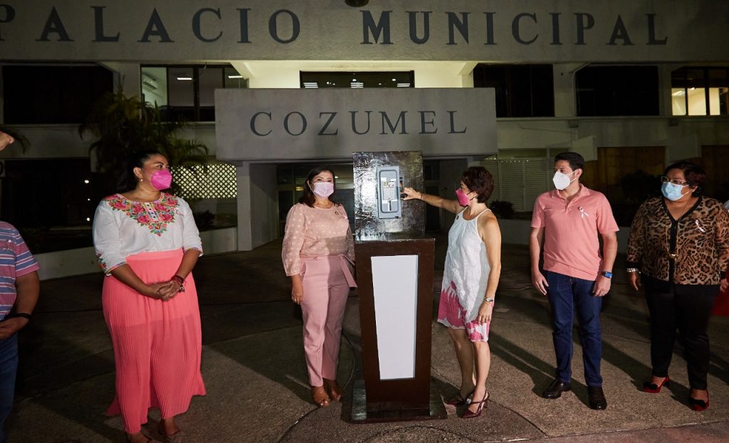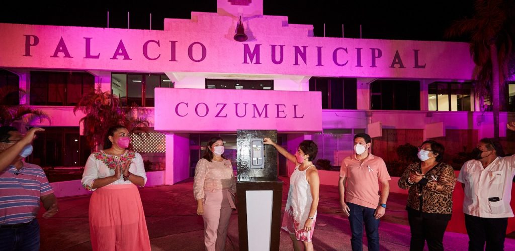 Cozumel, Q. Roo, sábado 02 de Octubre de 2021, poderycrítica.- La presidenta municipal, Juanita Alonso Marrufo, junto con la presidenta honoraria del Sistema para el Desarrollo Integral de la Familia en Cozumel (DIF), Susana del Mar Coral Villanueva subió el interruptor para iluminar el edificio del Palacio Municipal en el tradicional encendido de luces rosas para simbolizar la lucha contra el cáncer de mama.